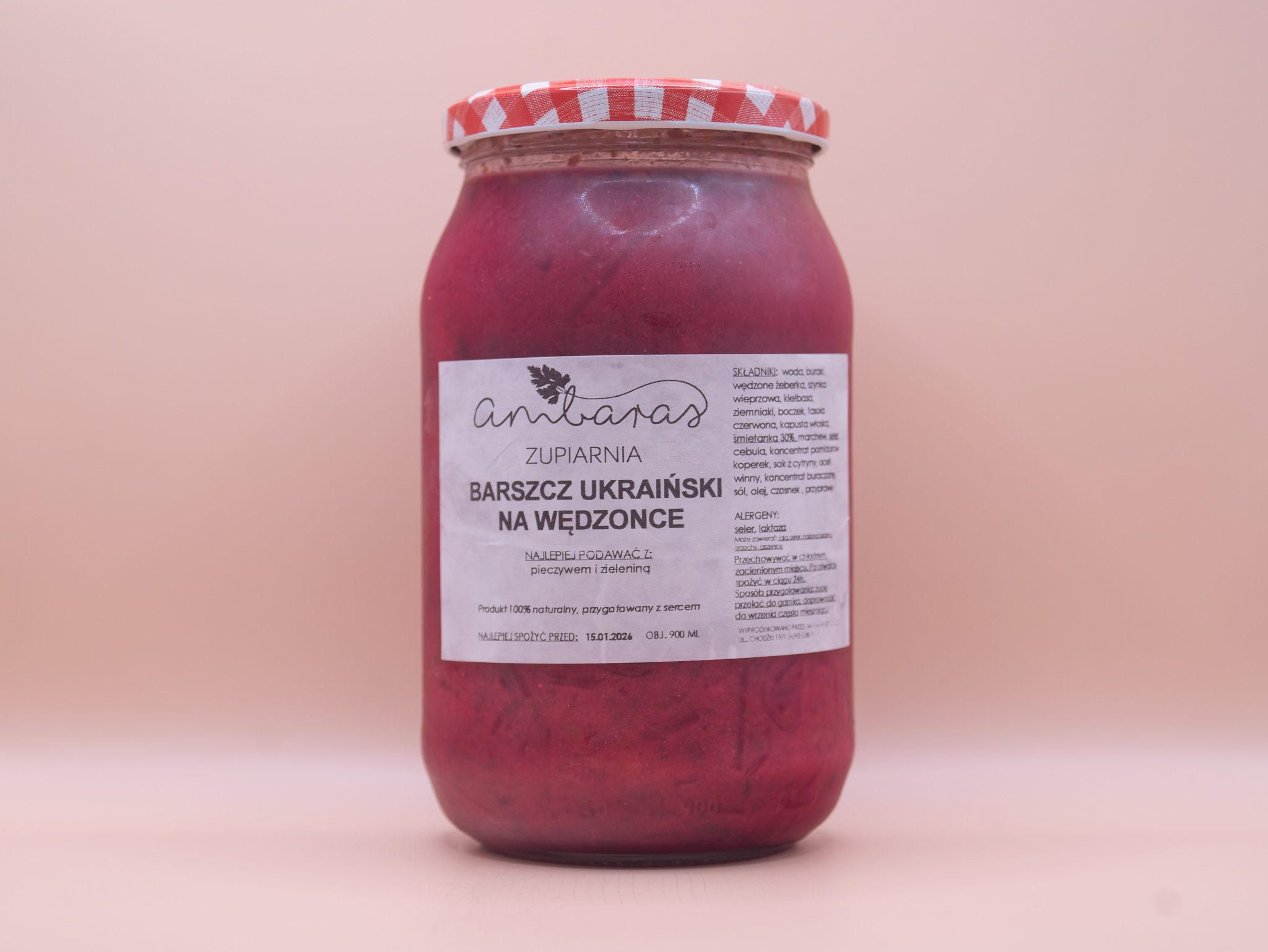 Barszcz ukraiński na wędzonce w słoiku 900 ml, tradycyjna zupa buraczana z warzywami przygotowana na aromatycznym wywarze