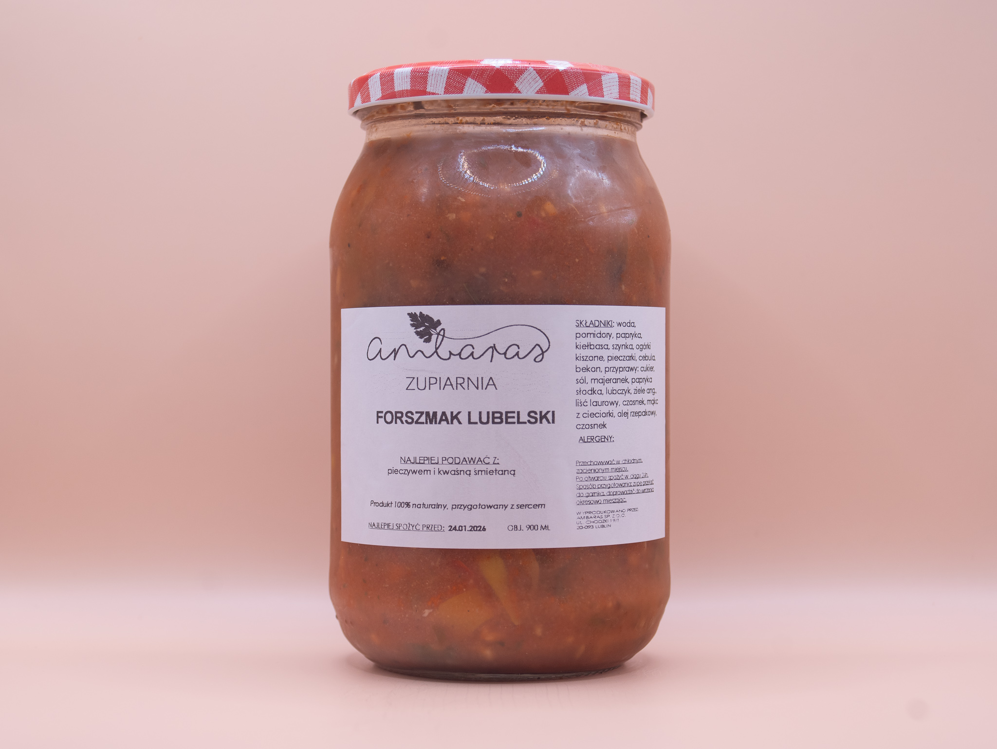 Składniki: woda, pomidory, papryka, kiełbasa, szynka wieprzowa, ogórki kiszone, pieczarki, zakwas z ogórków kiszonych, cebula, boczek, mąka z cieciorki, olej, czosnek, przyprawy: cukier, sól, czosnek mielony, majeranek, papryka słodka, lubczyk, papryka wędzona, pieprz, ziele angielskie, liść laurowy