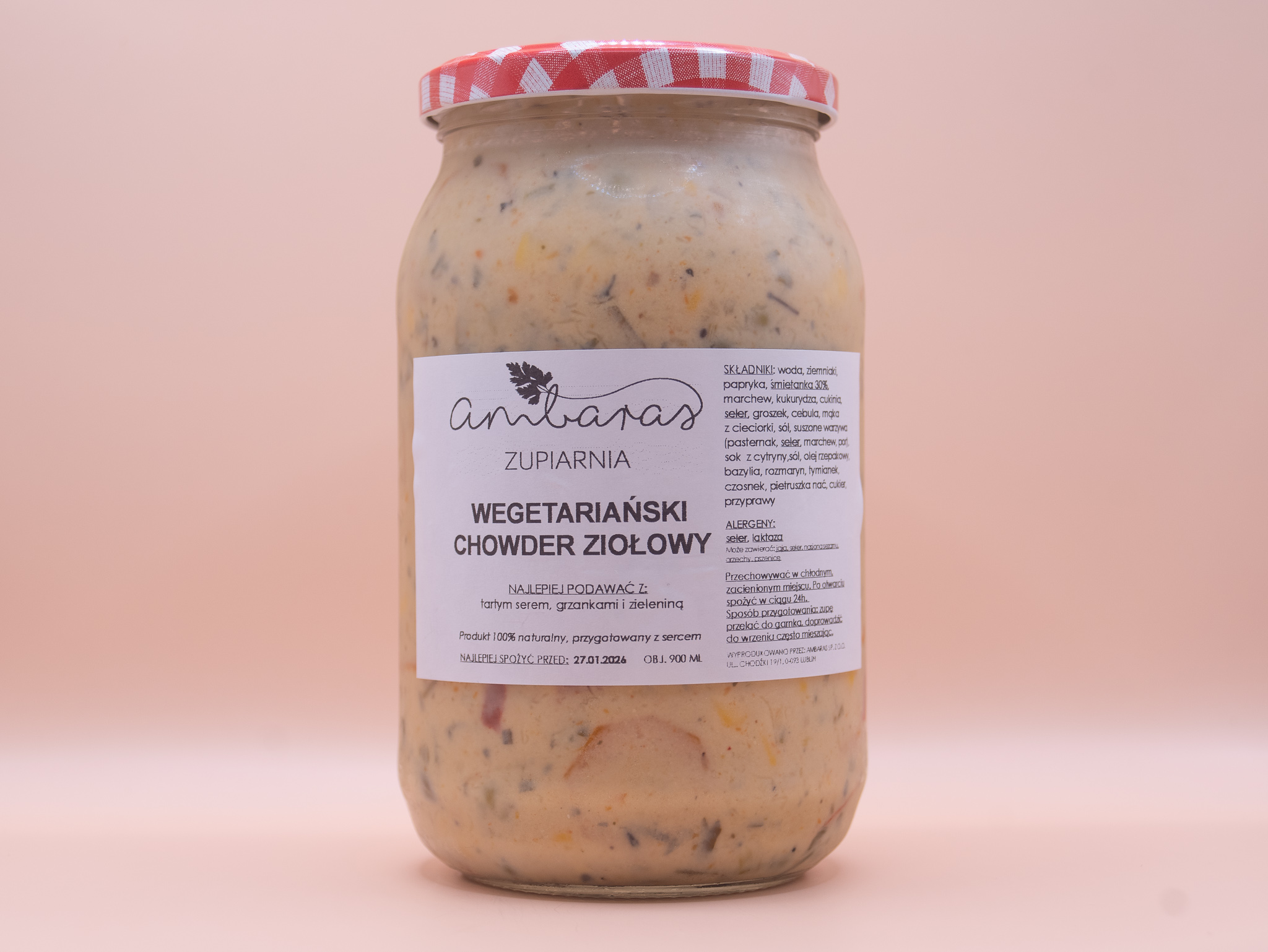 Składniki: woda, ziemniaki, marchew, śmietanka 30%, cukinia, seler naciowy, groszek, fasolka szparagowa, cebula, mąka kukurydziana, papryka, sok z cytryny, sól, olej rzepakowy, włoszczyzna suszona, przyprawy