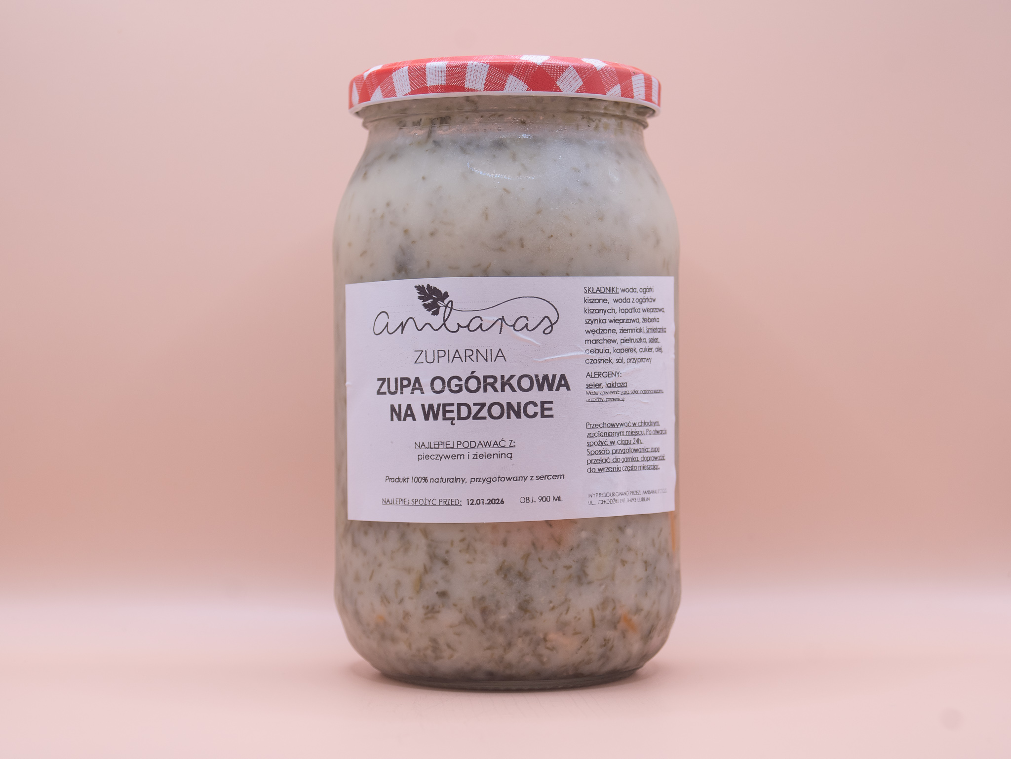 Składniki: woda, ogórki kiszone, zakwas z ogórków kiszonych, łopatka wieprzowa, szynka wieprzowa, żeberka wędzone, ziemniaki, śmietanka 30%, marchew, pietruszka, seler, cebula, koperek, cukier, olej, czosnek, sól, przyprawy