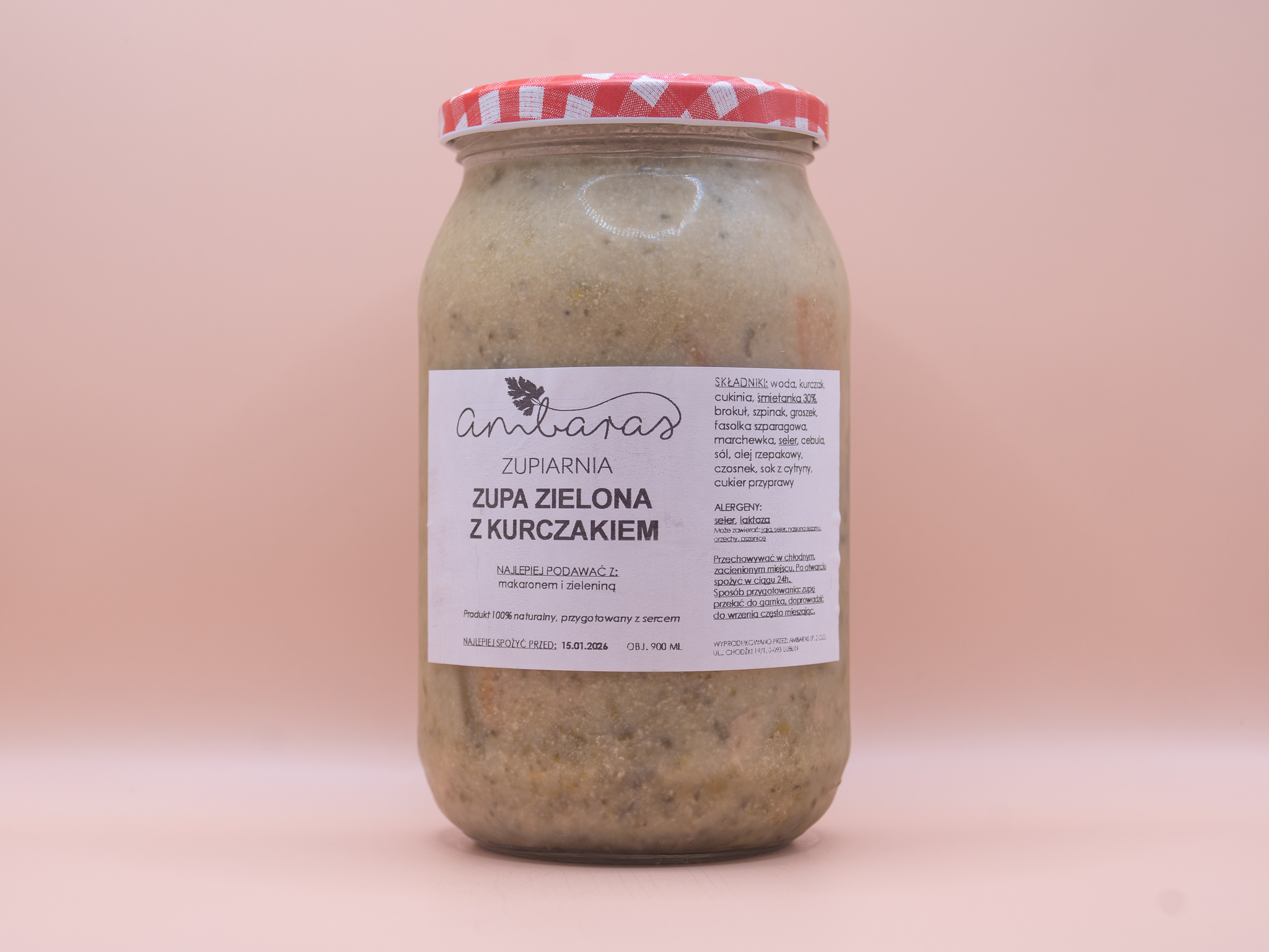 Składniki: woda, kurczak, cukinia, śmietanka 30%, brokuł, szpinak, groszek, fasolka szparagowa, marchewka, seler, cebula, sól, olej rzepakowy, czosnek, sok z cytryny, cukier przyprawy